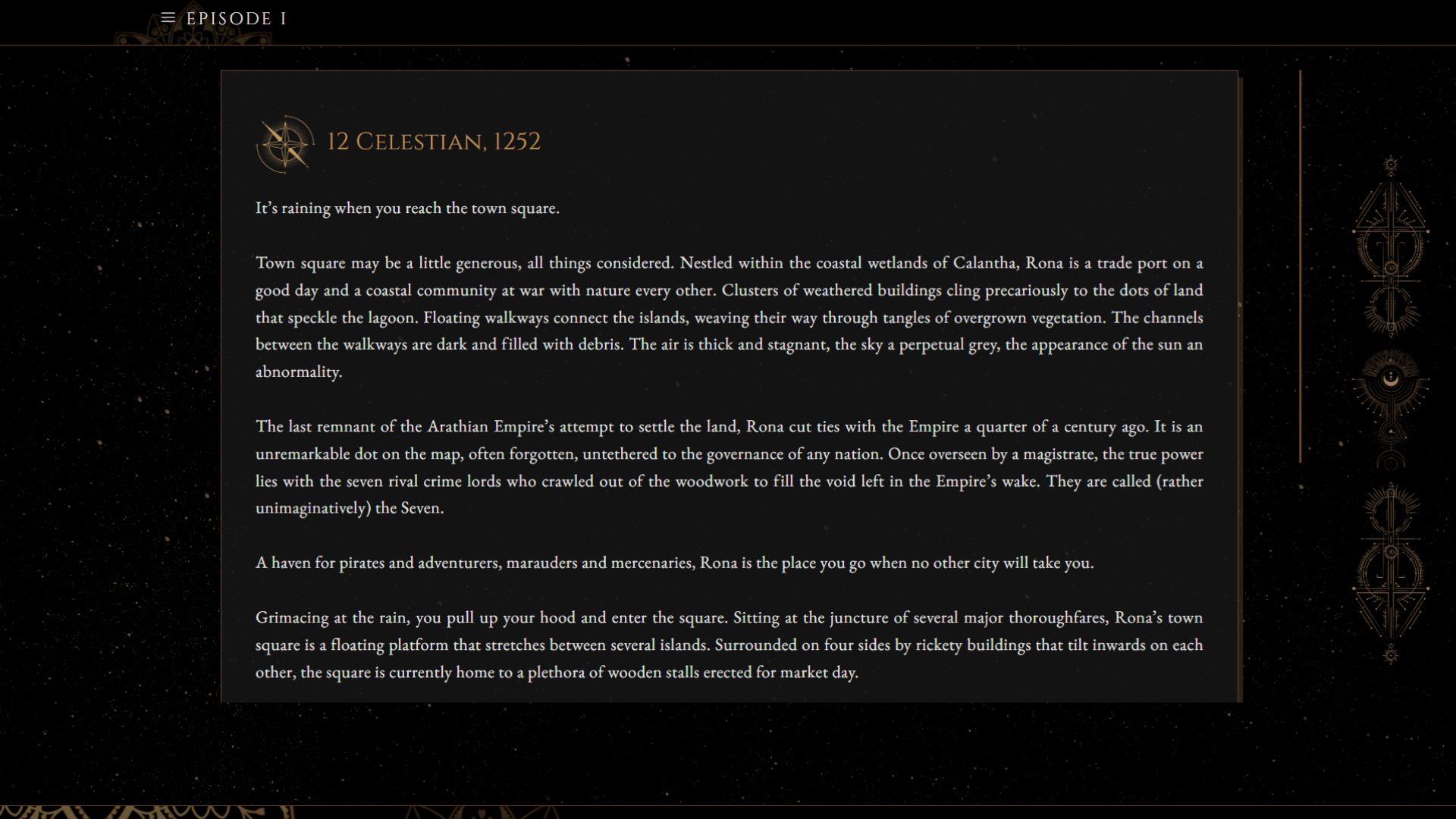When your mercenary work backs you into a corner, you take the only option available and accept a contract: to travel to the city of Velantis and steal an ancient artefact. Simple, right? But the city holds far more than you bargained for. Navigate rival factions, meddling guilds, and escalating political tensions as you unravel the mystery at the core of who and what you are, and discover a secret that will shake the foundation of this very world.